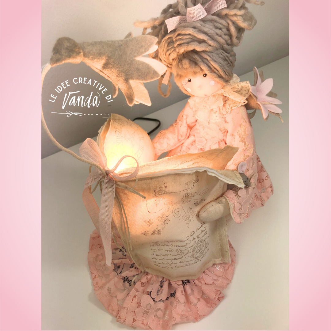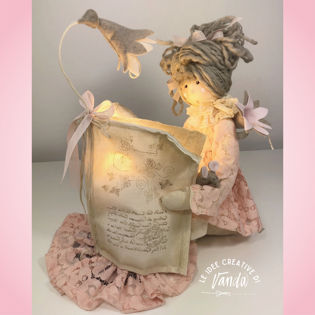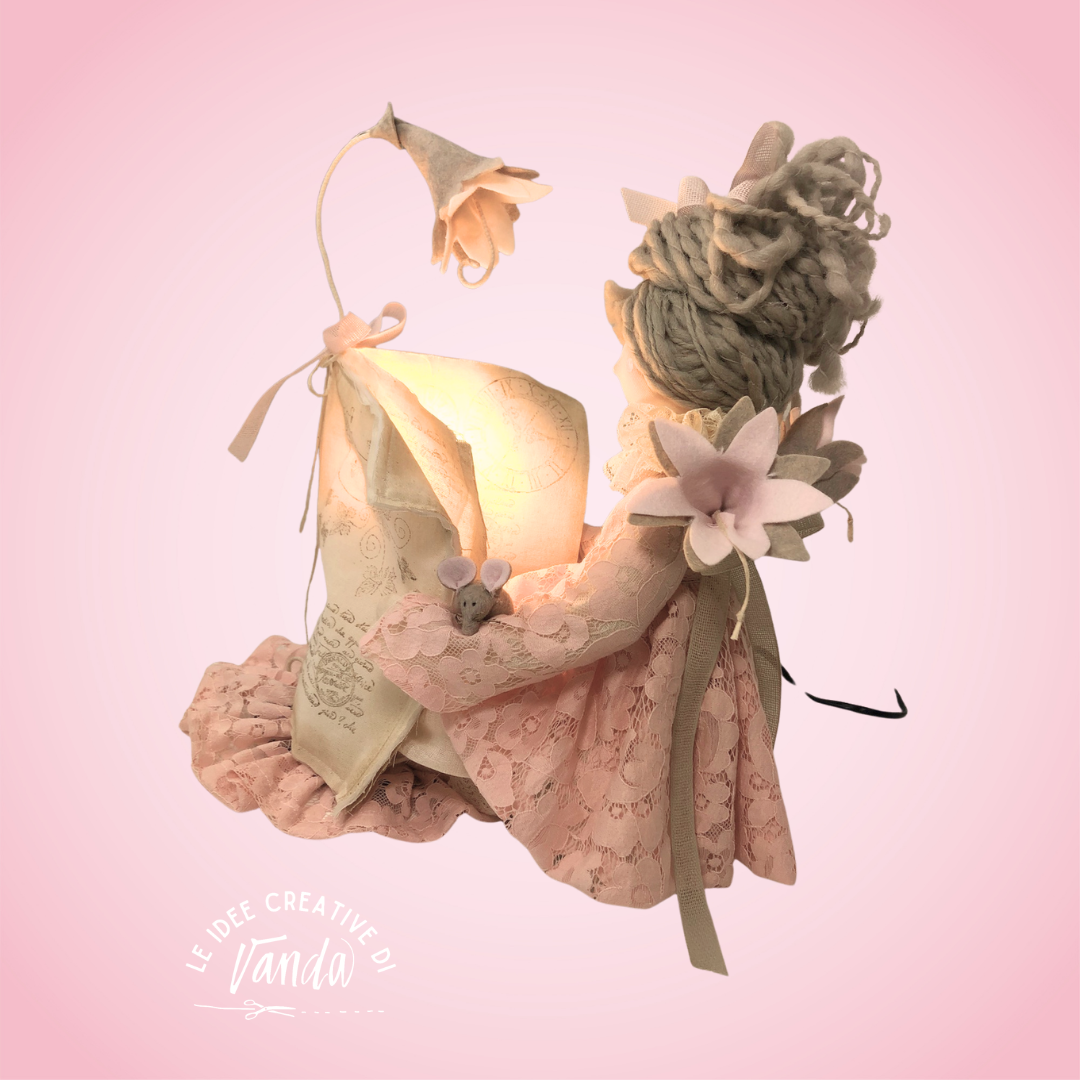 La sua particolarità è la posa: Zoe è inginocchiata accanto a una piccola lampada, coperta da un libro realizzato in tessuto, come se stesse vivendo un momento intimo di lettura e immaginazione. Accanto a lei sbocciano eleganti gigli in pannolenci che completano la scena e rendono il progetto ancora più romantico.